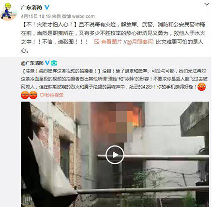 4月15日下午,一段长约42秒的火灾视频让“消防哥”怒了,广东省公安消防总队官方微博@广东消防进行言辞激烈的回应,“强烈唾弃这条视频的拍摄者”,引发广泛争议。 昨天,羊晚君(wanbaoweixin)也进行了报道:残忍的42秒!广州有人拍了一段火灾视频,广东消防怒了:唾弃、可耻、可鄙!